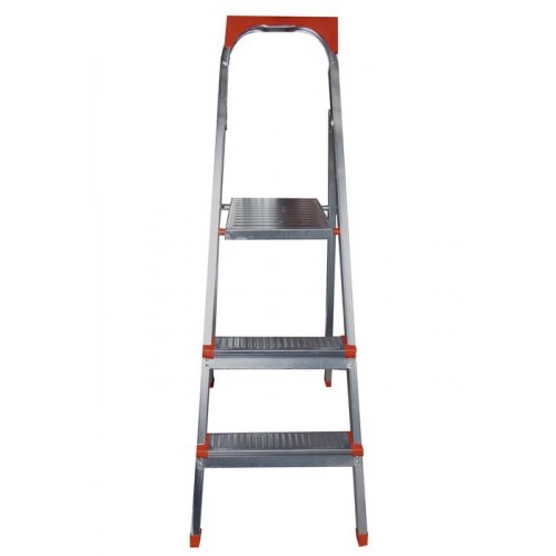 Бытовая стремянка металлическая оцинкованная с пластмассовой верхней полкой для инструментов. Стремянка рассчитана на нагрузку до 150 кг, удобна в быту и строительстве.