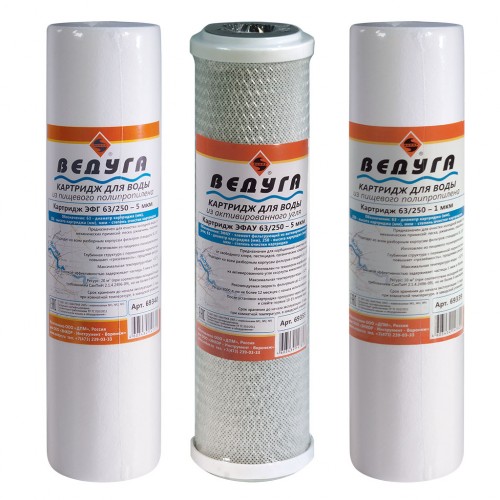 Комплект сменных фильтрующих элементов 3 штуки для фильтра арт.69370 Фильтр "ВЕДУГА" Стандарт 3 ступени очистки. Ресурс - не более 6 месяцев, в зависимости от загрязнения исходной воды.