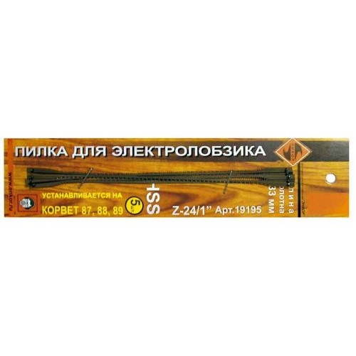 Комплект состоит из пяти пилок. Длина пилки 133 мм. Шаг зуба 24/1". Устанавливаются на электрические лобзики «Корвет 87», «Корвет 88». Материал HSS.