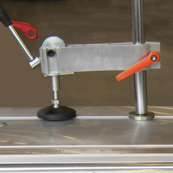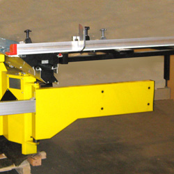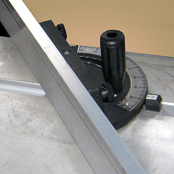 Алюминиевый фронтальный телескопический поворотный упор с линейкой и с двумя откидными упорами.   В комплекте удлинитель и расширитель стола.   Удобный эксцентриковый прижим заготовки.